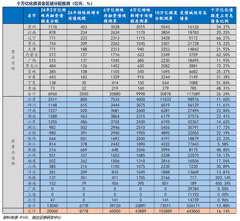 2024年對(duì)城投而言是化債大年。化債背景下,各省市近期隱債化債情況如何?隨著10萬(wàn)億化債資金落地,后續(xù)各省區(qū)域分配情況又會(huì)怎樣? 2024年是化債政策頻出的一年。上半年重要會(huì)議對(duì)化債表態(tài)積極,金融機(jī)構(gòu)支持平臺(tái)債務(wù)風(fēng)險(xiǎn)化解、SPV、統(tǒng)借統(tǒng)還等政策逐步落地,且化債方案期限延長(zhǎng)至27年6月份,支持區(qū)域也由重點(diǎn)省份向非重點(diǎn)省份全面展開。各省合發(fā)8000多億特殊新增專項(xiàng)債用于償還存量債務(wù),而且4000億特殊再融資債緩解地方隱債和拖欠企業(yè)款項(xiàng)償付的壓力。9月之后相關(guān)化債增量政策出臺(tái),特別是11月10萬(wàn)億化債資源落地,額度分配或向隱債存量規(guī)模較大的省份傾斜。僅1個(gè)月時(shí)間,2024年新增2萬(wàn)億置換債額度已發(fā)行完畢。隨著化債資源落地,及各地政府工作報(bào)告、預(yù)算調(diào)整、執(zhí)行報(bào)告的不斷披露。近期各地隱債化解情況如何? 據(jù)企業(yè)預(yù)警通數(shù)據(jù),近一周以來(lái),全國(guó)超80個(gè)地區(qū)在相關(guān)報(bào)告或會(huì)議中提及政府債務(wù)化解信息,其中近半數(shù)與置換存量隱債額度相關(guān)。80個(gè)地區(qū)中不乏一些知名一二線城市,如:南京獲302.91億元專項(xiàng)債務(wù)限額用于置換存量隱債;杭州市獲126.13億元,分配市本級(jí)16.6億元。除此之外,多地超額完成2024年隱債化解任務(wù)。舉例:2024年內(nèi)蒙古達(dá)拉特旗303%超額完成化解政府債務(wù)任務(wù),實(shí)現(xiàn)階段性清零;內(nèi)蒙古土默特右旗超額完成年度隱債化解任務(wù),成功實(shí)現(xiàn)退橙目標(biāo);德陽(yáng)市羅江區(qū)2024年完成化解任務(wù)207%,提前完成1家平臺(tái)公司隱債清零。 10萬(wàn)億化債資金 各省區(qū)域分配情況如何? 盡管2023年部分區(qū)域或?qū)﹄[債進(jìn)行補(bǔ)錄,但未補(bǔ)錄入隱債系統(tǒng)的平臺(tái)經(jīng)營(yíng)性債務(wù)或不在支持范圍。市場(chǎng)認(rèn)為10萬(wàn)億化債資源置換隱債主要針對(duì)2023年底已確認(rèn)的14.3萬(wàn)億隱債。 2024年2萬(wàn)億置換債額度發(fā)行完畢,其中六地規(guī)模超千億,分別為江蘇、湖南、河南、貴州、四川和山東。其中江蘇省發(fā)行規(guī)模最大,達(dá)到2511億元。由此可見,本次額度可能更多向城投債務(wù)體量較大、存量隱債較多的區(qū)域傾斜。化債背景下 多地超額完成隱債化解任務(wù)