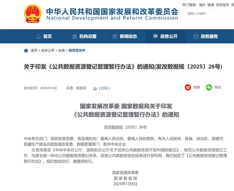 國家發(fā)展改革委 國家數(shù)據(jù)局關(guān)于印發(fā)《公共數(shù)據(jù)資源登記管理暫行辦法》的通知