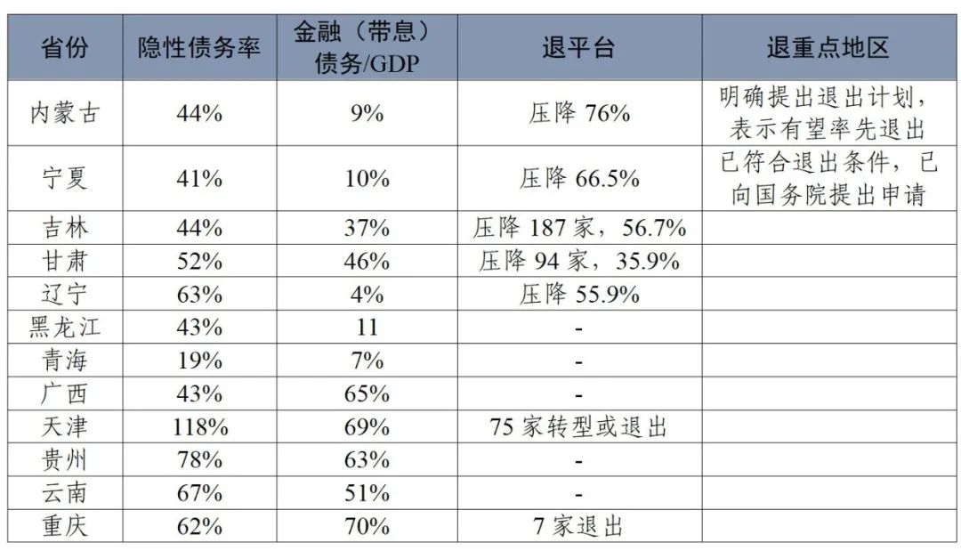 綜合來看,退出重點(diǎn)省份的順序或?yàn)椋?strong>第一批寧夏、內(nèi)蒙古、吉林、遼寧、青海、甘肅、黑龍江;第二批重慶、天津;第三批廣西、云南、貴州。結(jié)合隱債化解完成的時(shí)間來看,各地有望在2028年之前陸續(xù)完成重點(diǎn)省份序列的退出。