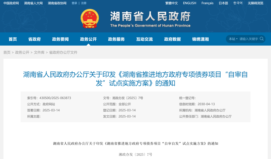 湖南省人民政府辦公廳關(guān)于印發(fā)《湖南省推進(jìn)地方政府專項(xiàng)債券項(xiàng)目“自審自發(fā)”試點(diǎn)實(shí)施方案》的通知