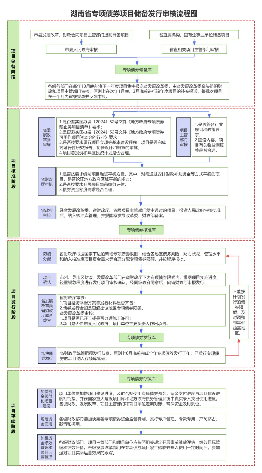 項(xiàng)目主管部門重點(diǎn)審核:①是否符合行業(yè)規(guī)劃和政策要求;②建設(shè)內(nèi)容、項(xiàng)目有關(guān)收益測(cè)算等是否合理。省發(fā)展改革委聯(lián)合省級(jí)項(xiàng)目主管部門對(duì)各級(jí)各部門報(bào)送項(xiàng)目開(kāi)展復(fù)審,其中,專項(xiàng)債券用于土地儲(chǔ)備、收購(gòu)存量商品房用作保障性住房的,由省發(fā)展改革委會(huì)同自然資源、住房城鄉(xiāng)建設(shè)部門開(kāi)展復(fù)審,通過(guò)后轉(zhuǎn)省財(cái)政廳進(jìn)一步復(fù)審。經(jīng)省發(fā)展改革委、省財(cái)政廳、省級(jí)項(xiàng)目主管部門復(fù)審?fù)ㄟ^(guò)的項(xiàng)目,報(bào)省人民政府審核批準(zhǔn)后,納入核準(zhǔn)庫(kù)管理,并報(bào)國(guó)家發(fā)展改革委、財(cái)政部備案。