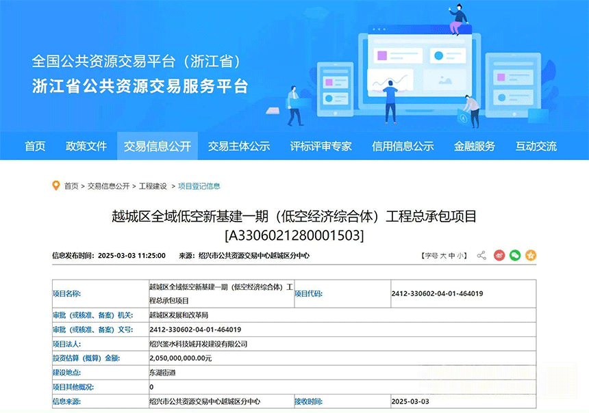2025年3月,浙江省公共資源交易服務(wù)平臺上發(fā)布項目公告——紹興市越城區(qū)全域低空新基建一期工程總承包項目,總投資規(guī)模達(dá)20.5億元。該項目不僅創(chuàng)下全國低空經(jīng)濟領(lǐng)域公開招標(biāo)項目的最高紀(jì)錄,同時也是全國首個以“全域低空新基建”命名的總承包項目,是低空經(jīng)濟從“試點探索”邁向“全域落地”的關(guān)鍵一步。