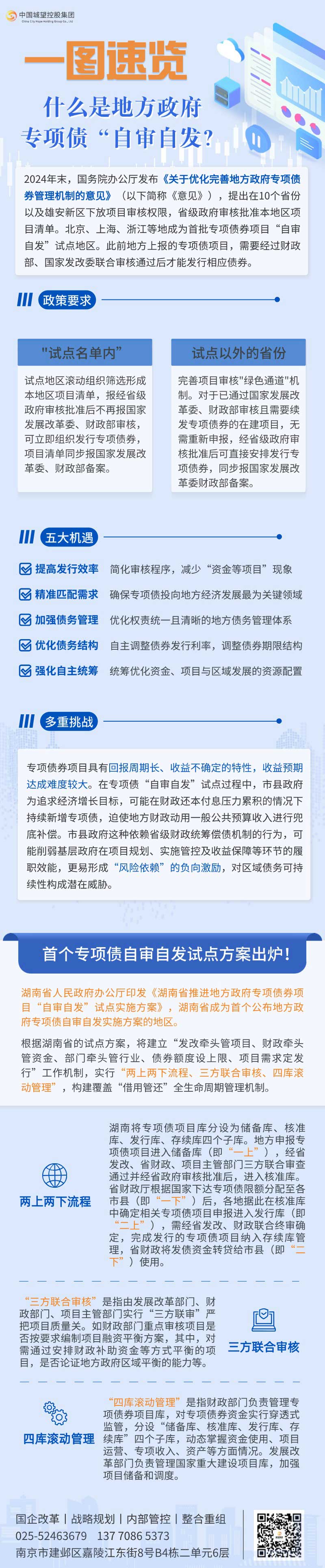 2024年12月,國務(wù)院辦公廳印發(fā)《關(guān)于優(yōu)化完善地方政府專項(xiàng)債券管理機(jī)制的意見》。其中提出,開展專項(xiàng)債券項(xiàng)目“自審自發(fā)”試點(diǎn),在北京市、上海市、江蘇省、浙江?。ê瑢幉ㄊ校不帐 ⒏=ㄊ。ê瑥B門市)、山東?。ê鄭u市)、湖南省、廣東?。ê钲谑校?、四川省10個(gè)省份以及雄安新區(qū)下放項(xiàng)目審核權(quán)限,省級政府審核批準(zhǔn)本地區(qū)項(xiàng)目清單。今年3月,湖南省成為首個(gè)公開發(fā)布地方政府專項(xiàng)債券自審自發(fā)實(shí)施方案的地區(qū)。