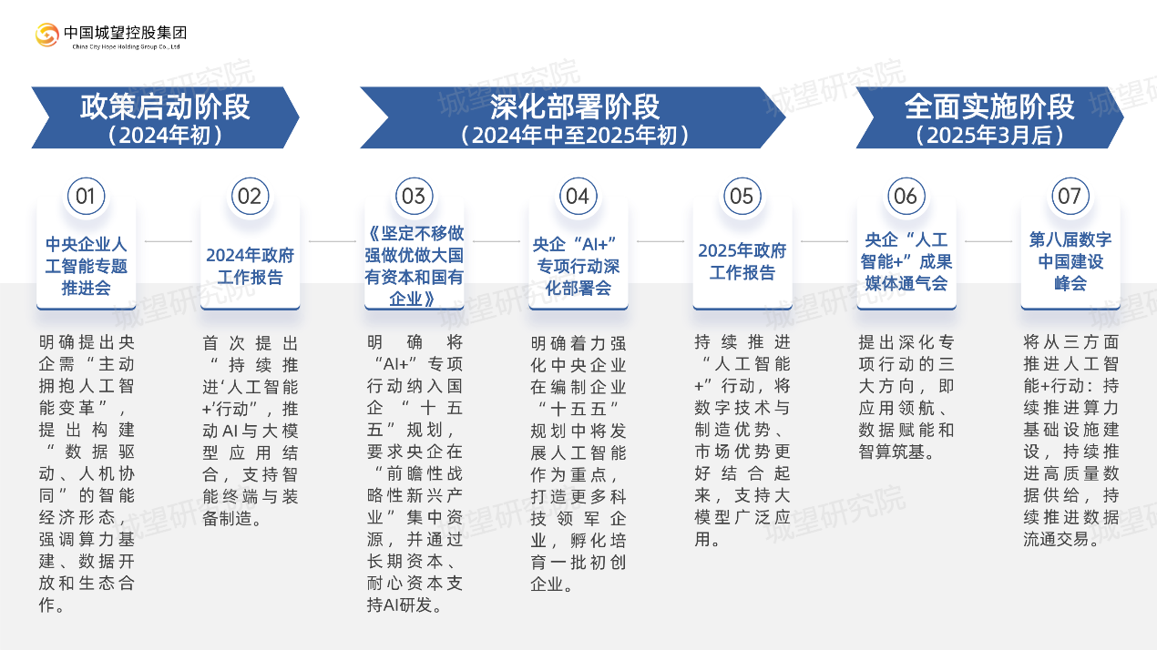 從“新基建”到“數(shù)字經(jīng)濟”,是數(shù)字經(jīng)濟的發(fā)展根基從“有沒有”到價值釋放“怎么用”的過程,對國有企業(yè)如何落實“產(chǎn)業(yè)數(shù)字化”與“數(shù)字產(chǎn)業(yè)化”的雙向融合,推動傳統(tǒng)產(chǎn)業(yè)升級與新興數(shù)字產(chǎn)業(yè)發(fā)展提出更高要求。黨的二十屆三中全會著重強調(diào)“健全促進實體經(jīng)濟和數(shù)字經(jīng)濟深度融合制度”,將數(shù)實融合提升到了新的高度。今年以來,國家數(shù)據(jù)局、工業(yè)和信息化部等部門圍繞數(shù)字產(chǎn)業(yè)高質(zhì)量發(fā)展、算力基礎(chǔ)設(shè)施建設(shè)、大數(shù)據(jù)產(chǎn)業(yè)等領(lǐng)域,釋放出一系列政策信號,要求推動數(shù)據(jù)資源化、資產(chǎn)化和要素化。政策目標從最初的注重數(shù)字經(jīng)濟規(guī)模擴張,逐漸轉(zhuǎn)變?yōu)樽非蟾哔|(zhì)量發(fā)展,無論是以算力基礎(chǔ)設(shè)施和數(shù)據(jù)要素賦能城市治理、提升公共服務(wù)智能化水平,還是通過AI應(yīng)用培育新產(chǎn)業(yè)、新業(yè)態(tài),國家戰(zhàn)略為城投AI轉(zhuǎn)型提供了明確方向和實施路徑,而城投AI轉(zhuǎn)型不僅是響應(yīng)政策號召從“被動適應(yīng)”轉(zhuǎn)向“主動引領(lǐng)”,更是履行城市綜合服務(wù)運營商使命的必然選擇。
