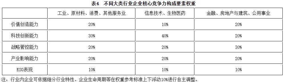 圍繞9個(gè)大類(lèi)行業(yè),各構(gòu)成要素的權(quán)重設(shè)置側(cè)重點(diǎn)不同,其中工業(yè)、原材料、消費(fèi)行業(yè)、其他服務(wù)業(yè)強(qiáng)調(diào)各項(xiàng)能力均衡,信息技術(shù)、生物醫(yī)藥突出科技創(chuàng)新能力,房地產(chǎn)與建筑、金融、公用事業(yè)突出戰(zhàn)略管控能力(表4)。