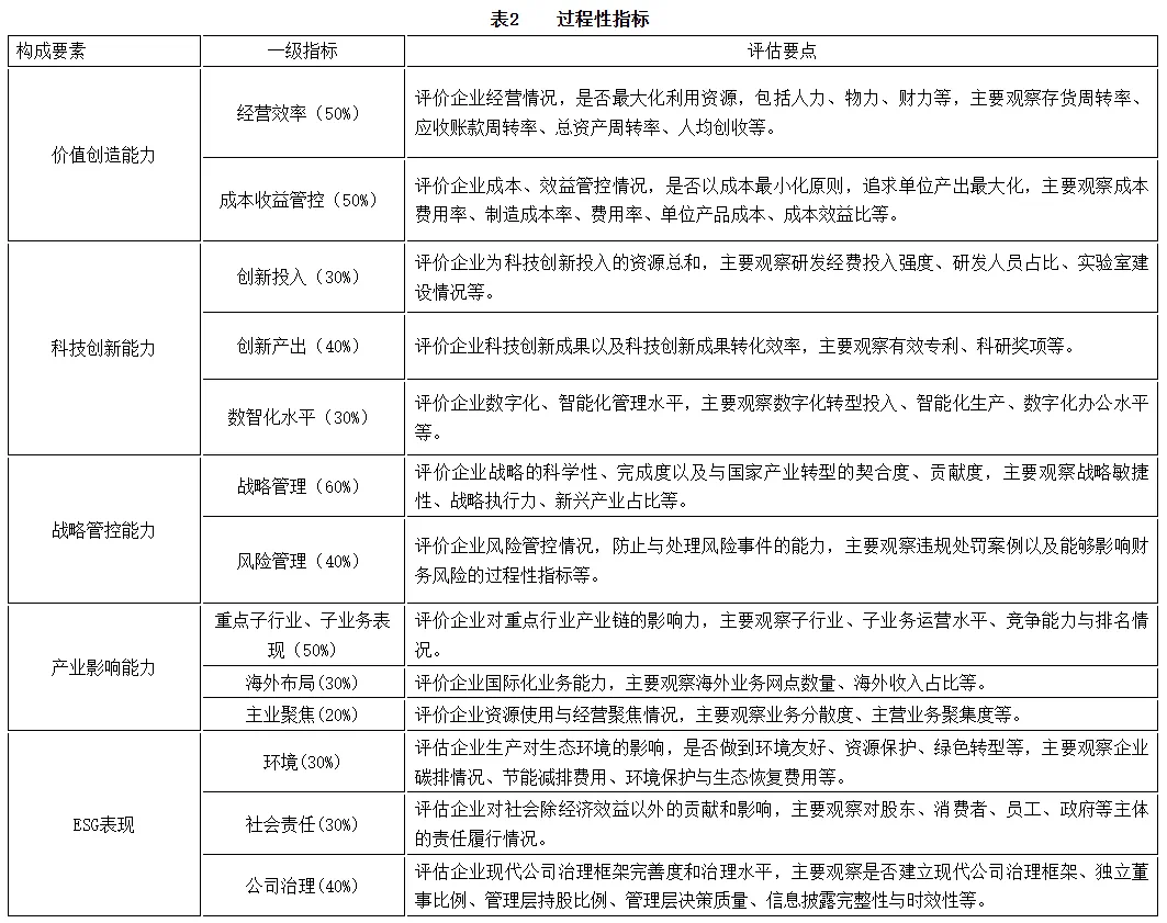 第二個(gè)“1”,為一套過(guò)程性指標(biāo),用以分析企業(yè)核心競(jìng)爭(zhēng)力強(qiáng)弱的原因,通過(guò)觀察核心競(jìng)爭(zhēng)力的構(gòu)成,捕捉關(guān)鍵要素變化,為企業(yè)明確長(zhǎng)短板以及重點(diǎn)能力培育方向。具體劃分為價(jià)值創(chuàng)造能力、科技創(chuàng)新能力、戰(zhàn)略管控能力、產(chǎn)業(yè)影響能力、ESG表現(xiàn)5個(gè)要素,共13個(gè)一級(jí)指標(biāo)(表2),指標(biāo)內(nèi)容及權(quán)重固定。其中,價(jià)值創(chuàng)造能力重點(diǎn)體現(xiàn)企業(yè)在競(jìng)爭(zhēng)中能夠?qū)崿F(xiàn)更高的效率或更低的成本;科技創(chuàng)新能力重點(diǎn)體現(xiàn)企業(yè)科技創(chuàng)新投入規(guī)模、創(chuàng)新產(chǎn)出效率以及業(yè)務(wù)模式創(chuàng)新。戰(zhàn)略管控能力重點(diǎn)體現(xiàn)企業(yè)戰(zhàn)略規(guī)劃的科學(xué)性、敏捷性以及風(fēng)險(xiǎn)管理情況。產(chǎn)業(yè)影響能力重點(diǎn)體現(xiàn)企業(yè)在相關(guān)產(chǎn)業(yè)鏈中的優(yōu)勢(shì)地位以及海外布局情況。ESG表現(xiàn)重點(diǎn)體現(xiàn)企業(yè)在環(huán)境、治理和社會(huì)責(zé)任等方面的效能。