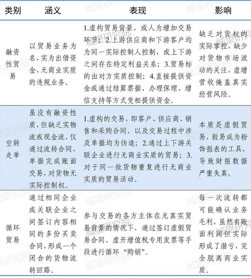 這一新增要求旨在精準(zhǔn)甄別相關(guān)主體貿(mào)易業(yè)務(wù)的真實(shí)性與商業(yè)合理性,有效遏制利用貿(mào)易業(yè)務(wù)虛增營(yíng)收、粉飾財(cái)務(wù)報(bào)表等刻意造假行為。(二)開(kāi)展貿(mào)易業(yè)務(wù)“十不準(zhǔn)”2023年10月,國(guó)務(wù)院國(guó)資委正式發(fā)布《關(guān)于規(guī)范中央企業(yè)貿(mào)易管理嚴(yán)禁各類(lèi)虛假貿(mào)易的通知》(國(guó)資發(fā)財(cái)評(píng)規(guī)〔2023〕74號(hào),以下簡(jiǎn)稱(chēng)“74號(hào)文”),明確提出“十不準(zhǔn)”監(jiān)管要求,系統(tǒng)梳理融資性貿(mào)易、空轉(zhuǎn)走單、循環(huán)貿(mào)易(表1)等10類(lèi)典型違規(guī)行為。表1:融資性貿(mào)易、空轉(zhuǎn)走單、循環(huán)貿(mào)易涵義、表現(xiàn)及影響(三)嚴(yán)格按照收入準(zhǔn)則的相關(guān)規(guī)定進(jìn)行判斷和會(huì)計(jì)處理2023年12月,財(cái)政部發(fā)布《關(guān)于嚴(yán)格執(zhí)行企業(yè)會(huì)計(jì)準(zhǔn)則切實(shí)做好企業(yè)2023年年報(bào)工作的通知》(財(cái)會(huì)〔2023〕29號(hào)),重點(diǎn)強(qiáng)化收入確認(rèn)中主要責(zé)任人和代理人的認(rèn)定標(biāo)準(zhǔn),明確要求貿(mào)易、百貨、電商等行業(yè)需結(jié)合商業(yè)模式,嚴(yán)格按收入準(zhǔn)則規(guī)范會(huì)計(jì)處理。這一規(guī)定與“74號(hào)文”中的“不準(zhǔn)違反會(huì)計(jì)準(zhǔn)則規(guī)定確認(rèn)代理貿(mào)易收入”形成政策合力,明確要求通過(guò)控制權(quán)轉(zhuǎn)移、風(fēng)險(xiǎn)承擔(dān)等要素判斷業(yè)務(wù)實(shí)質(zhì),杜絕以全額法虛增收入的違規(guī)操作,推動(dòng)貿(mào)易業(yè)務(wù)收入確認(rèn)回歸商業(yè)實(shí)質(zhì)。04