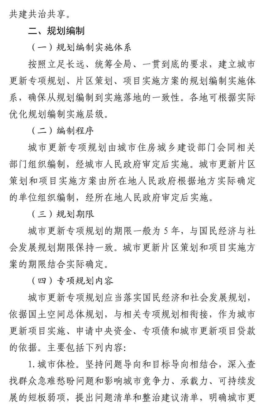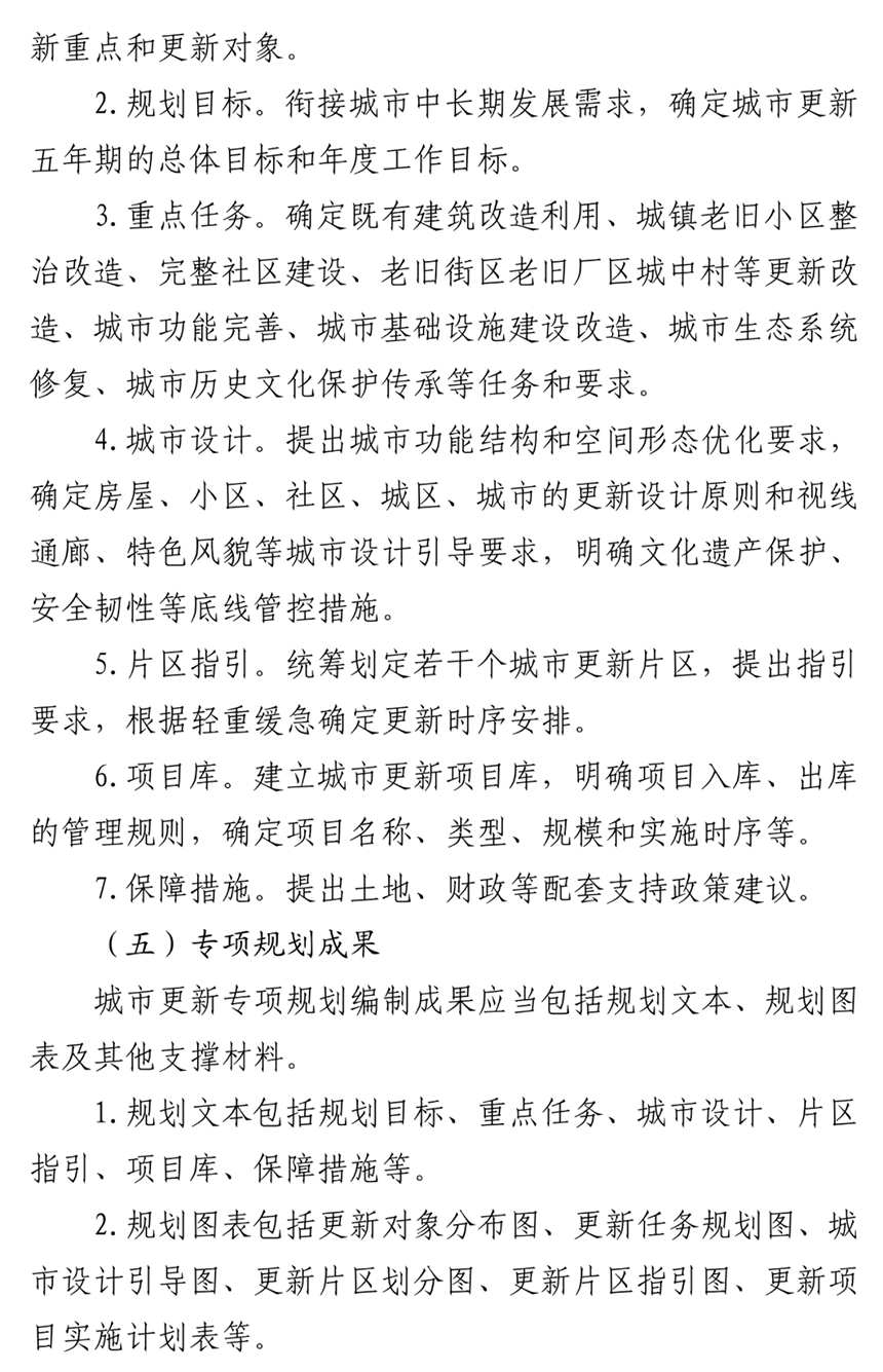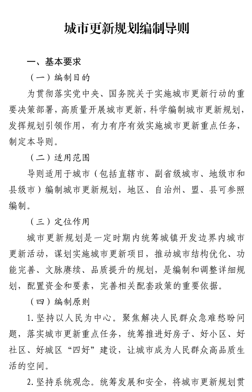 為深入貫徹中央城市工作會(huì)議精神,落實(shí)《中共中央辦公廳、國務(wù)院辦公廳關(guān)于持續(xù)推進(jìn)城市更新行動(dòng)的意見》,指導(dǎo)各地制定實(shí)施城市更新專項(xiàng)規(guī)劃,建立完善“專項(xiàng)規(guī)劃—片區(qū)策劃—項(xiàng)目實(shí)施方案”的規(guī)劃實(shí)施體系,住房城鄉(xiāng)建設(shè)部組織編制了《城市更新規(guī)劃編制導(dǎo)則》,要求結(jié)合實(shí)際做好城市更新規(guī)劃編制實(shí)施工作。