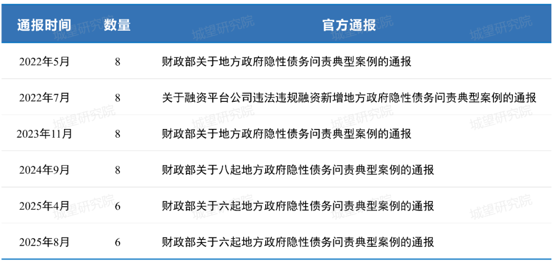 從2022年首次披露問責(zé)案例開始,截至2025年已形成六次系統(tǒng)性通報(bào),覆蓋安徽、河南、貴州、江西、湖南、浙江等21個(gè)省份的44起典型案例,累計(jì)問責(zé)市縣級黨政領(lǐng)導(dǎo)干部、財(cái)政部門負(fù)責(zé)人及國有企業(yè)高管240余人次。地方政府隱性債務(wù)問責(zé)典型案例的通報(bào)機(jī)制通過持續(xù)曝光違規(guī)舉債、虛假化債等典型案例,既彰顯了“零容忍”、“終身問責(zé)、倒查責(zé)任”的監(jiān)管態(tài)度,更為地方政府規(guī)范舉債融資行為、國有企業(yè)合規(guī)經(jīng)營提供了清晰指引。如何從問責(zé)典型案例中深入剖析違規(guī)根源、系統(tǒng)提煉合規(guī)規(guī)律,為地方政府堅(jiān)決遏制新增隱性債務(wù)、國有企業(yè)筑牢經(jīng)營合規(guī)底線提供實(shí)踐指引?隱性債務(wù)問責(zé)作為防范化解重大風(fēng)險(xiǎn)的治理手段,在財(cái)政部歷年通報(bào)的典型案例中呈現(xiàn)出鮮明特征,折射出從個(gè)案懲處到系統(tǒng)治理的演進(jìn)邏輯,其核心特征可從披露時(shí)間、區(qū)域分布、問責(zé)主體等維度深入解析。(一)披露時(shí)間:通報(bào)機(jī)制持續(xù)化、常態(tài)化根據(jù)財(cái)政部公開通報(bào)及權(quán)威媒體報(bào)道(表1),地方政府隱性債務(wù)問責(zé)典型案例的通報(bào)呈現(xiàn)階段性特征:2015-2017年的案例,主要通過2022年后的回溯通報(bào)集中披露(《財(cái)政部關(guān)于地方政府隱性債務(wù)問責(zé)典型案例的通報(bào)》(2022年5月)、《關(guān)于融資平臺(tái)公司違法違規(guī)融資新增地方政府隱性債務(wù)問責(zé)典型案例的通報(bào)》(2022年11月));2018-2021年,財(cái)政部暫停全國性集中通報(bào),相關(guān)案例改由地方紀(jì)委監(jiān)委通過官網(wǎng)、媒體等渠道零散發(fā)布。2022-2025年,財(cái)政部連續(xù)四年系統(tǒng)披露此類典型案例。表1:2022年-2025年財(cái)政部關(guān)于隱性債務(wù)問責(zé)典例的通報(bào)從披露時(shí)間看,被問責(zé)的違規(guī)行為最早可追溯至2015年,而集中通報(bào)則始于2022年之后,地方政府隱性債務(wù)問責(zé)典型案例的通報(bào)呈現(xiàn)回溯特征。這種特征并非簡單的時(shí)間滯后,而是監(jiān)管部門對債務(wù)違規(guī)行為進(jìn)行全周期清查、對歷史遺留問題進(jìn)行系統(tǒng)梳理的體現(xiàn)。從披露頻次看,隱性債務(wù)問責(zé)通報(bào)呈現(xiàn)出“逐步加密、近年加速”的特征。2022年啟動(dòng)系統(tǒng)通報(bào)時(shí)為一年兩次,2023年、2024年維持一年一次,2025年則密集至一年兩次。這種頻次的提升,并非簡單的數(shù)量疊加,而是彰顯監(jiān)管部門對隱性債務(wù)風(fēng)險(xiǎn)“抓早抓小、露頭就打”的主動(dòng)防控態(tài)勢。(二)區(qū)域分布:問責(zé)區(qū)域下沉式穿透從分布區(qū)域來看,中西部低能級城市(地級市及以下)成為違規(guī)高發(fā)區(qū)。從財(cái)政部2022年至2025年披露的44起案例來看,這些隱債問責(zé)案例集中分布在中西部、東北及部分東部省份,呈現(xiàn)“西重東輕、北多南少”的格局。江西省、河南省累計(jì)通報(bào)4次,安徽省、陜西省累計(jì)通報(bào)3次,東三省則均被通報(bào)2次。從問責(zé)層級來看,監(jiān)管正從地級市向區(qū)縣級、鎮(zhèn)級深度穿透。2025年4月通報(bào)的問責(zé)典型案例中,下沉至鎮(zhèn)級(河南省開封市杞縣五里河鎮(zhèn));8月案例中,將近七成為區(qū)縣級,其中3起為區(qū)級,1起為開發(fā)區(qū)。從地級市到區(qū)縣級,再到鄉(xiāng)鎮(zhèn)和開發(fā)區(qū),問責(zé)層級與債務(wù)風(fēng)險(xiǎn)分布高度契合。(三)問責(zé)主體:覆蓋地方政府、融資平臺(tái)、金融機(jī)構(gòu)等6次通報(bào)的問責(zé)主體覆蓋地方政府、融資平臺(tái)、地方國企和金融機(jī)構(gòu),彰顯了監(jiān)管體系對風(fēng)險(xiǎn)源頭、傳導(dǎo)路徑和責(zé)任主體的全面覆蓋。地方政府作為決策核心,是問責(zé)的首要對象。其責(zé)任集中于違規(guī)舉債的決策環(huán)節(jié),涵蓋從市級到區(qū)縣級甚至鎮(zhèn)級的各級行政主體,通過對地方黨委政府負(fù)責(zé)人的問責(zé),從源頭遏制政績沖動(dòng)下的違規(guī)融資決策。融資平臺(tái)與地方國企作為隱性債務(wù)的載體,是問責(zé)的重點(diǎn)執(zhí)行層。這類主體承擔(dān)著政府指令性融資、墊資代建等功能,其違規(guī)行為往往源于政企邊界模糊。對其問責(zé)既包括企業(yè)負(fù)責(zé)人,也延伸至具體業(yè)務(wù)環(huán)節(jié),旨在推動(dòng)國企剝離政府融資功能,回歸市場化經(jīng)營本位。金融機(jī)構(gòu)作為資金供給方,被納入問責(zé)體系體現(xiàn)了資金端管控的強(qiáng)化(例如對江蘇金融租賃、山東國際信托、建設(shè)銀行駐馬店分行、中國農(nóng)業(yè)銀行股份有限公司蕪湖分行、新都桂城村鎮(zhèn)銀行等問責(zé))。從銀行到信托、融資租賃公司,金融機(jī)構(gòu)因違規(guī)提供融資、配合政府隱性擔(dān)保被追責(zé),反映出監(jiān)管對項(xiàng)目到債務(wù)全鏈條的穿透式管理。通過約束資金供給行為,遏制金融機(jī)構(gòu)與地方政府的違規(guī)合作,從源頭減少隱性債務(wù)的資金來源。一方面,以批評教育、誡勉、警告等輕處分為主,凸顯