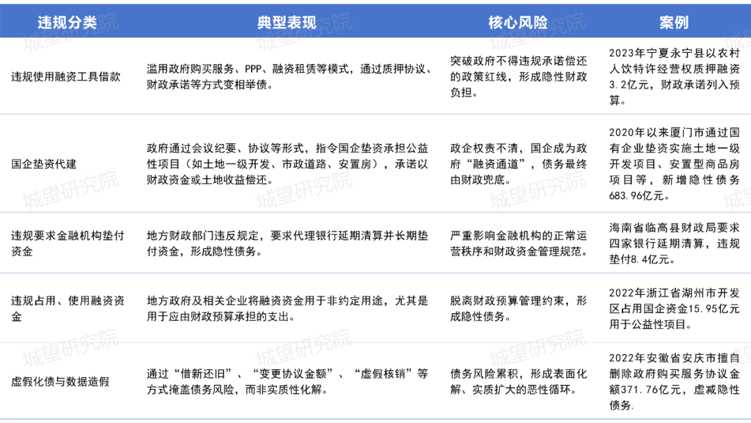 隱性債務(wù)違規(guī)行為的演變軌跡清晰可見:早期多以顯性違規(guī)為主,政府直接出具承諾函、擔(dān)保函等文件,為融資平臺(tái)或項(xiàng)目融資“背書”,此類行為形式較為直白;近期違規(guī)行為更趨隱蔽,新增隱性債務(wù)常通過財(cái)政補(bǔ)貼等隱蔽方式承諾還款,以及虛假項(xiàng)目包裝等方式,將政府償債責(zé)任隱藏在復(fù)雜交易結(jié)構(gòu)中。這種演變既反映監(jiān)管壓力下的違規(guī)行為異化,也為隱性債務(wù)治理帶來新的挑戰(zhàn)。一是發(fā)展訴求與財(cái)政約束的失衡。傳統(tǒng)的政績考核體系側(cè)重經(jīng)濟(jì)增長、項(xiàng)目建設(shè)等顯性指標(biāo),部分地方黨政干部為追求短期政績而忽視債務(wù)風(fēng)險(xiǎn)。并且在現(xiàn)有財(cái)政框架下,工業(yè)化與城鎮(zhèn)化加速推動(dòng)地方政府承擔(dān)大量基建、民生等剛性支出。地方政府既要履行公共服務(wù)職能,又缺乏可持續(xù)的融資渠道,最終發(fā)展沖動(dòng)突破了財(cái)政承受能力邊界。二是政企邊界與權(quán)責(zé)劃分的模糊。城投公司作為地方經(jīng)濟(jì)發(fā)展和城市建設(shè)的重要抓手,存在“政府點(diǎn)菜、企業(yè)買單”的錯(cuò)位。政府以行政指令將公益性項(xiàng)目交予城投,實(shí)質(zhì)是將政府責(zé)任轉(zhuǎn)嫁。這種邊界不清使得城投公司背離市場化主體屬性,淪為“財(cái)政的錢袋子”,既擾亂企業(yè)市場化經(jīng)營秩序,也成為隱性債務(wù)滋生的重要誘因。三是監(jiān)管效能與違規(guī)行為存在博弈。部分地區(qū)抱持“上有政策、下有對策”的僥幸心理,通過非規(guī)范文件為違規(guī)行為提供隱性支撐,試圖規(guī)避監(jiān)管約束。此類行為反映出監(jiān)管末梢效能仍有不足,政策執(zhí)行的“最后一公里”尚未完全打通,需進(jìn)一步強(qiáng)化全鏈條監(jiān)管的落地實(shí)效,筑牢隱性債務(wù)防控防線。03