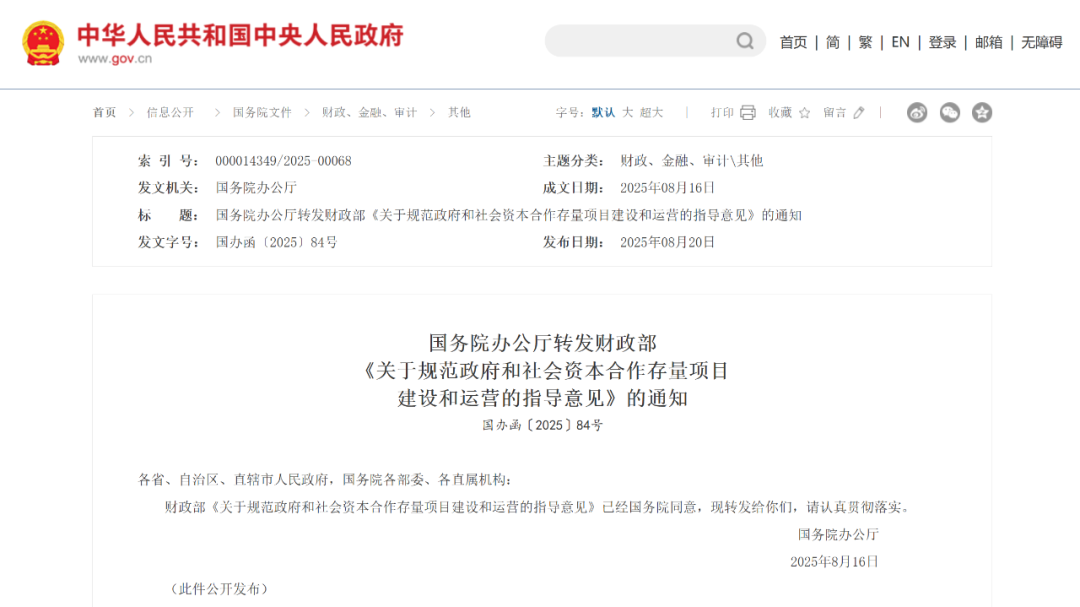8月20日,國務院辦公廳轉(zhuǎn)發(fā)財政部《關于規(guī)范政府和社會資本合作存量項目建設和運營的指導意見》(下稱《意見》),明確對于存量PPP(政府和社會資本合作)項目,地方政府要“依法履約按效付費”,保障PPP在建項目順利建設、推動已運營項目平穩(wěn)運行。