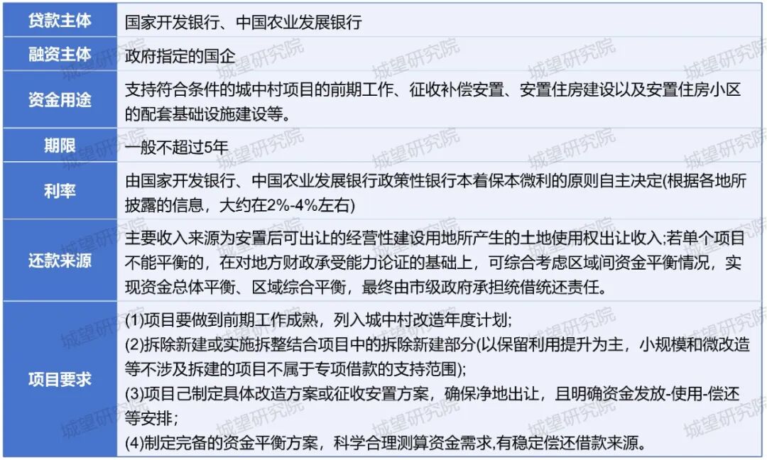 根據(jù)住建部、財政部、中國人民銀行、金融監(jiān)管總局印發(fā)的《關(guān)于通過專項借款支持城中村改造工作方案》,城中村改造專項借款(表2)以城市為單位,由市人民政府承擔統(tǒng)借統(tǒng)還責任,確定合格的地方國企(原則為市屬全資國企)作為借款主體,向國家開發(fā)銀行、中國農(nóng)業(yè)發(fā)展銀行兩家政策銀行申請的資金。